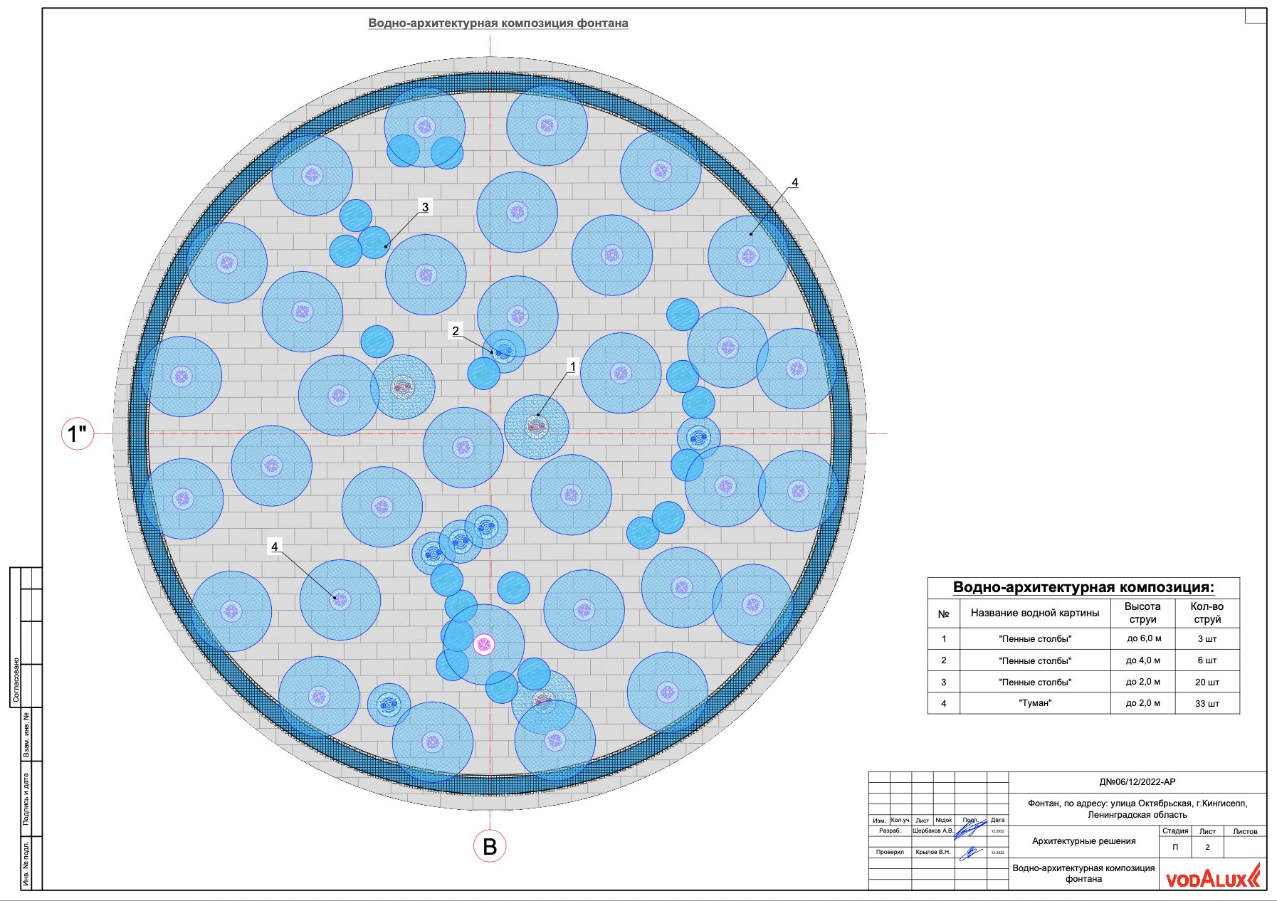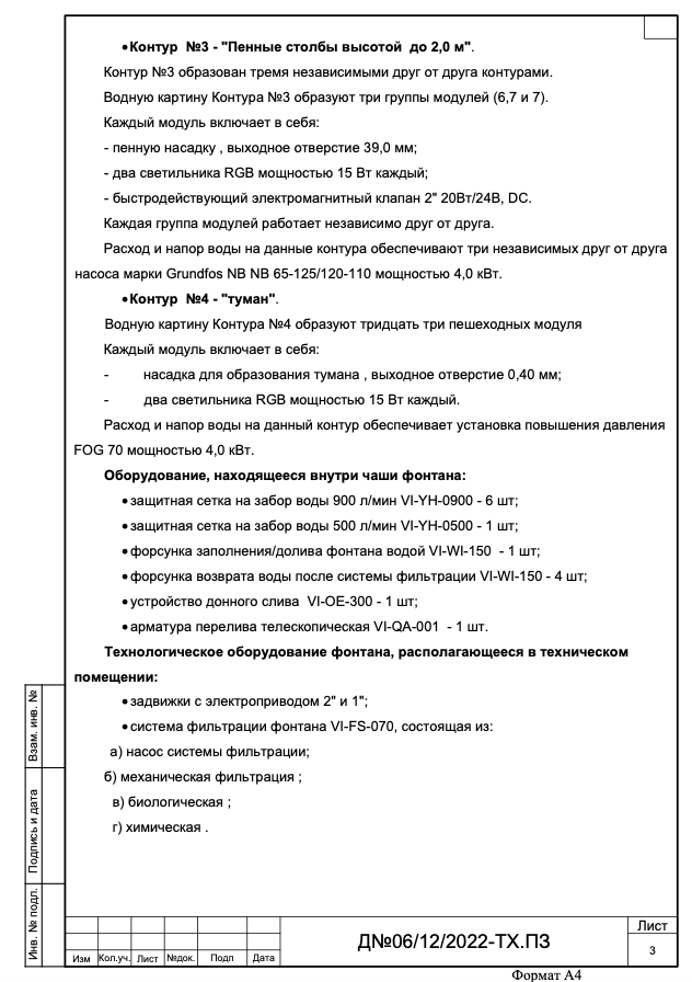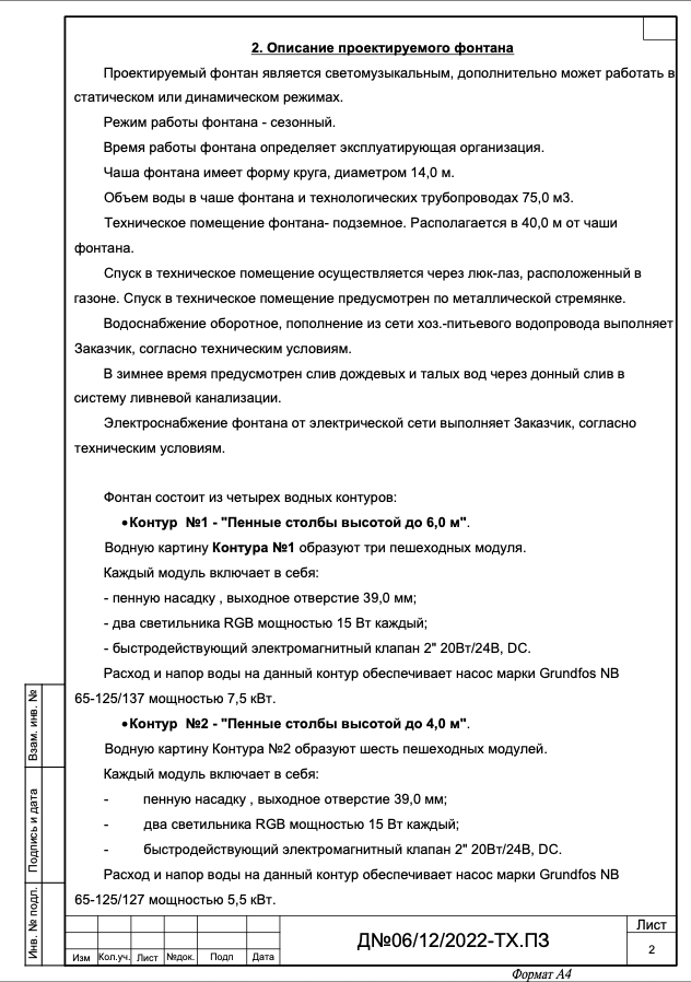 Спойлер 3. После проведения экспертизы данного проекта были выявлены множественные ошибки в исполнении всех частей проекта, полное отсутствие расчётов всех устройств и конструкций, или каких-либо пояснений по выбору и применению. Отсутствует технико-экономическое обоснование применения систем водоочистки от плавательного бассейна. Не предоставлена информация об объёме и периодичности обслуживания фонтанного оборудования и сооружений. Отсутствует информация о требованиях, предъявляемых к обслуживающему персоналу фонтана (разрешения, допуски, категории и т.д). Отсутствует информация о категории опасности объекта и необходимости обязательной регистрации в органах Ростехнадзора). Отсутствует информация об организации зимней консервации фонтана (условия, порядок, перечень и объём работ). В перечне нормативных документов указаны нормы и правила, не относящиеся к данному типу сооружений, а требования, указанные в этих нормативах выполнены лишь частично. После экспертизы Заказчик отказался от применения данной "проектной документации" , перенёс реализацию на следующий год и обратился к другой организации. Фонтан построен и запущен в ноябре 2025 года по другому проекту.