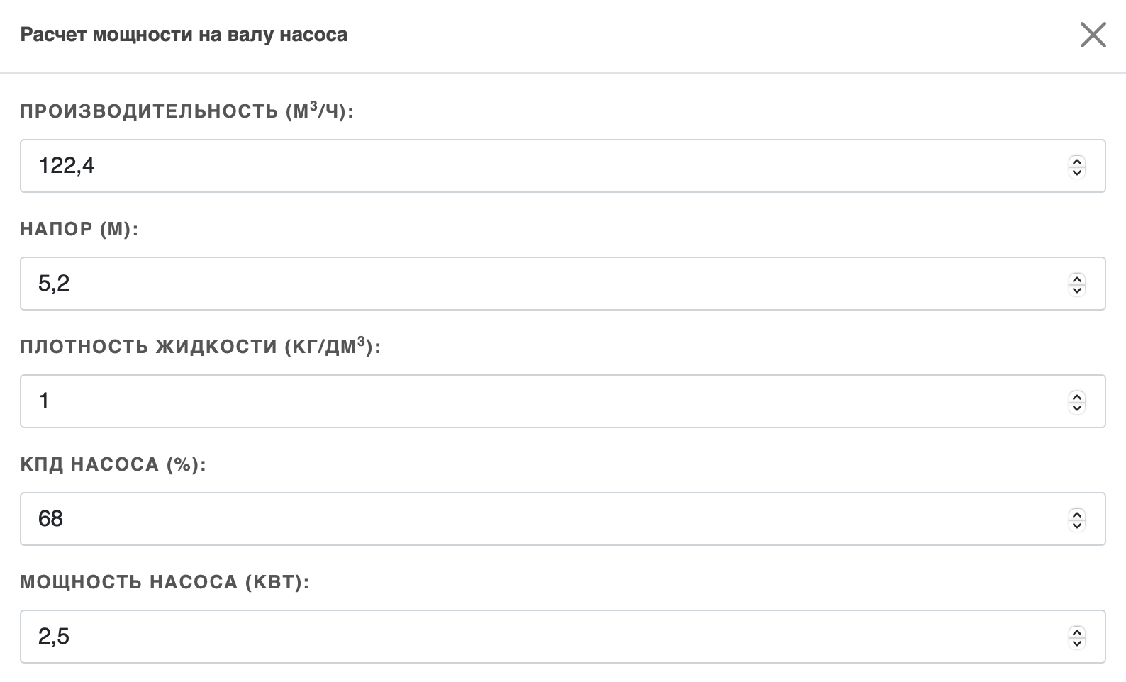 Считаем требуемые характеристики каждого гидравлического контура и подставляем в калькулятор для расчёта требуемой мощности насоса: